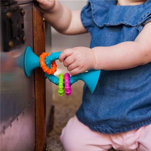 Little explorers can’t help but get sucked into the sensory excitement of these bendy, rattly, chewy, suction-cup creations! Their vivid textures instantly inspire little fingers to grab and feel while their soft silicone material simultaneously makes them perfect for soothing sore gums.