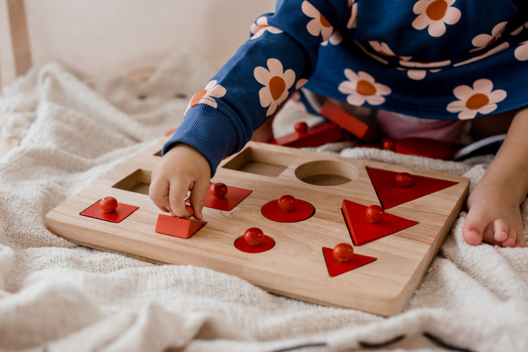 Our toddler knob puzzle has been designed based off a Montessori inspired learning. This puzzle has been designed as one colour is to encourage concentration onto the size sorting and shape recognition of the puzzle pieces making it less overwhelming for your child.