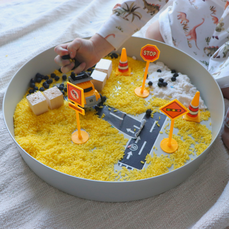 Perfect for little hands to explore and get all that delicious sensory feedback. Discover all the different colours while developing fine motor skills by scooping, pouring, mixing and sorting. Gorgeous wooden scoop included! The sensory rice is made with vinegar and oil-based food colouring.